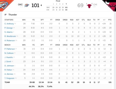 圧倒的だったのは、2Qのブルズの得点を8点に押さえたこと。正直、その時のサンダーのオフェンスも決して良いとは言えなかったけれど、ディフェンスは明らかに良かった。