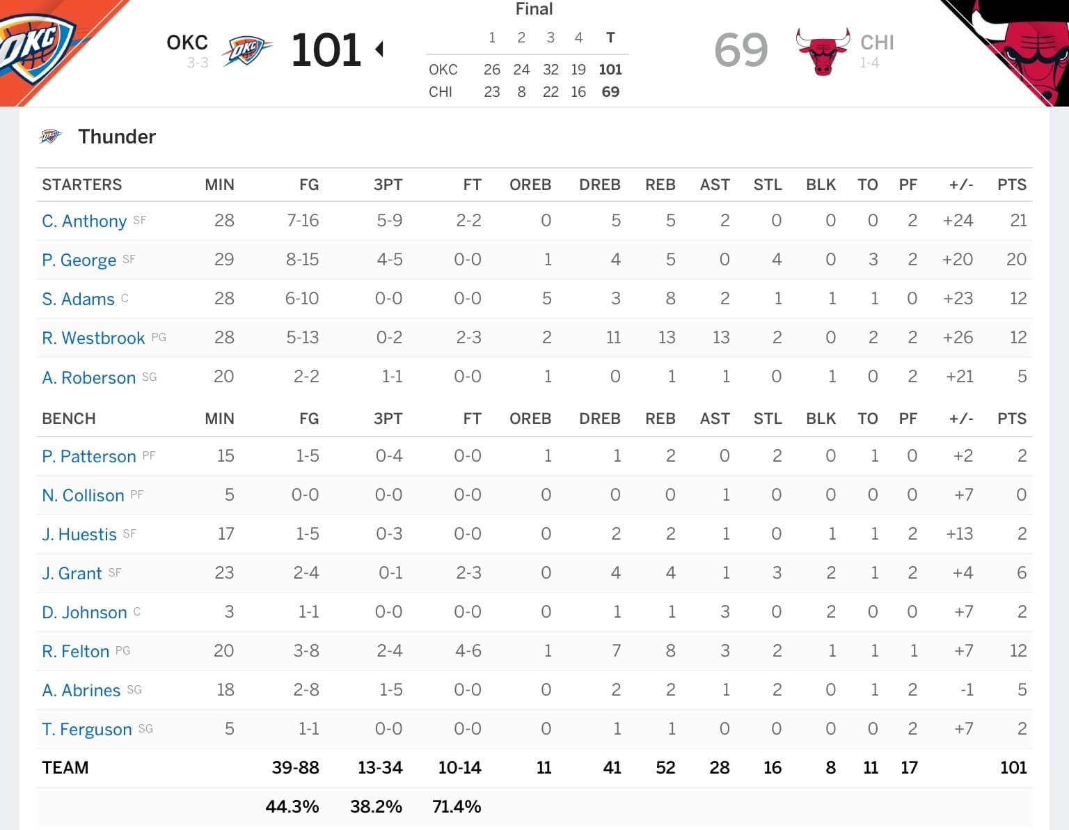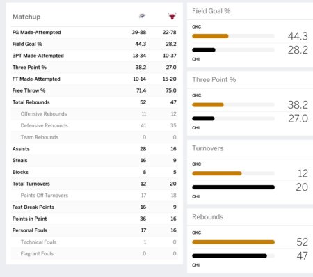 そして、前回課題だったディフェンスを見れば、ブルズのフィールドゴール%を28%に押さえ、スティールが16もあり、相手に20もターンオーバーをさせているのは上々。