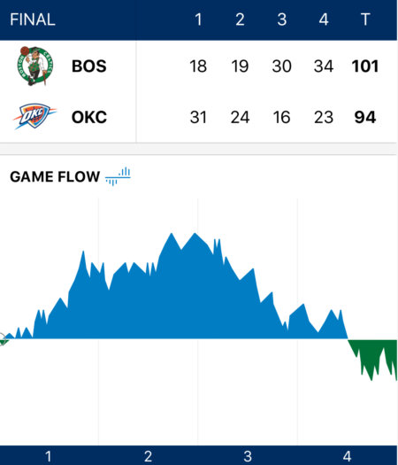 アリーナも大盛り上がりで。でもフローとスコアを見ればわかるように、後半になってどんどんセルティックスが追い上げてきた。3Qはサンダーの方が16点と押さえられ、一気に追いつかれ、カイリーとホーフォードに泣かされる結果に。