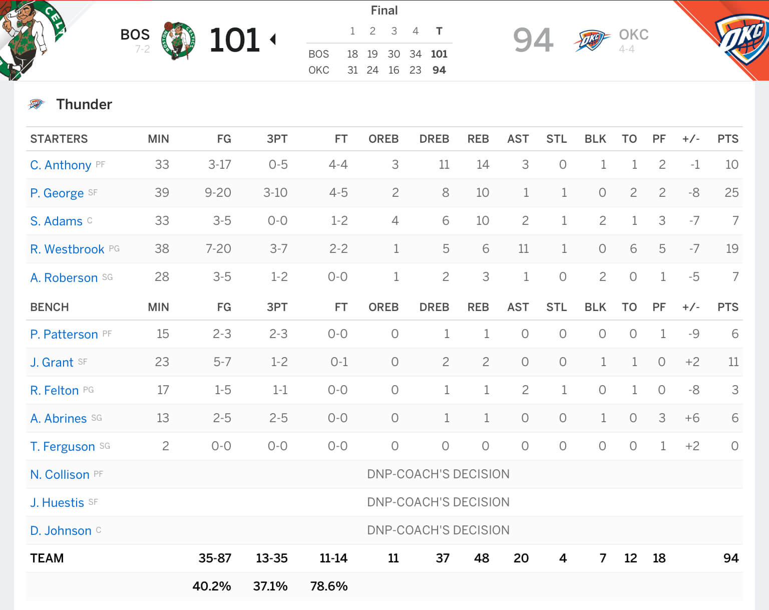 最初こそバタバタとしていたものの、前半のサンダーのディフェンスは堅く、セルティックスを37点(カイリー3点!)に押さえることに成功。