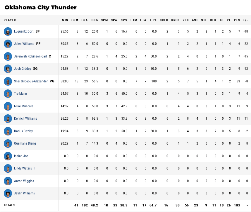 3ポイントショットは16本中6本成功(37.5%)で、ペイント内の得点が32点(ピストンズは26点)、フィールドゴールは52本中24本成功(46.2%)。サンダーにしてはまずまずだ。