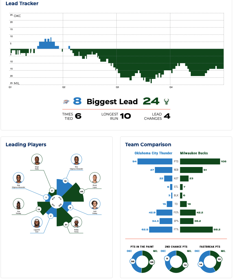 サンダーがいつも頑張るリバウンドだが、前半だけでバックスが32リバウンド(12オフェンシブリバウンド)>サンダーは18リバウンド(4オフェンシブリバウンド)と差を見せつけられ、最終的にはバックスが55リバウンド(18)、サンダーが38(9)と圧倒的な違いだった。