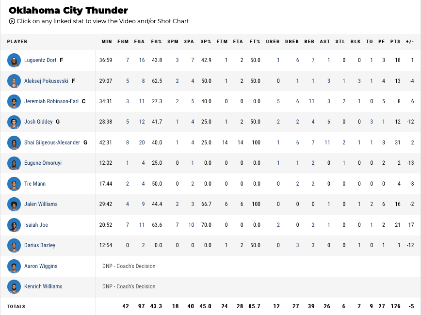GAME RESULT : OKC 126 – DEN 131 L 7-11(18/82)