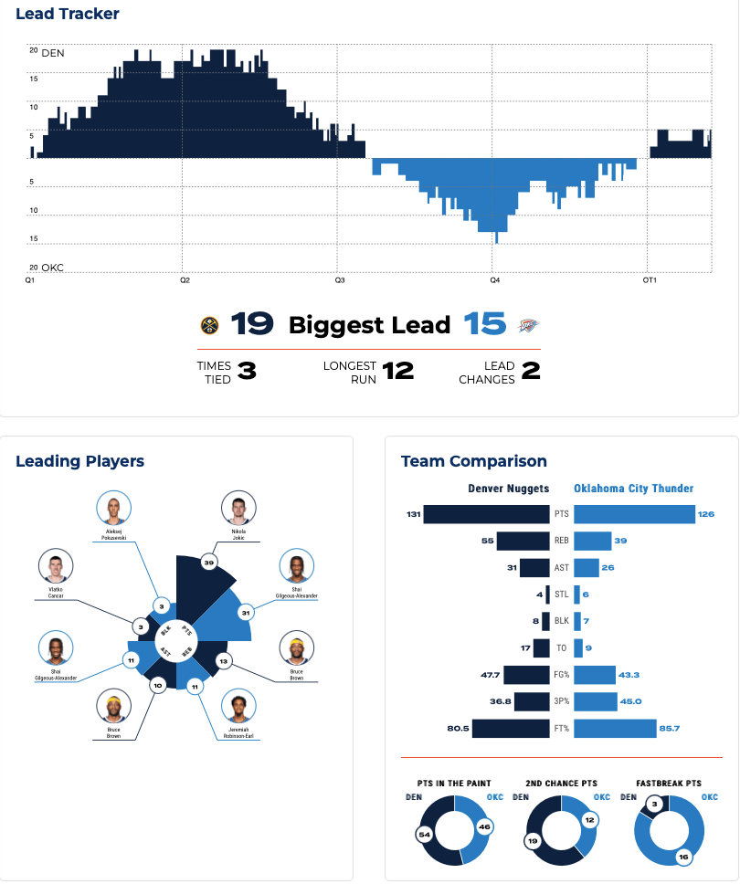 マレーやMPJを欠くナゲッツは、ゴードンが31得点、ブラッコ・チャンチャーが19得点、ブルース・ブラウンが17得点(13リバウンド、10アシストのトリプルダブル)、ケンテイビアス・コードウェル・ポープが15得点を記録。特にチャンチャーとブラウンのステップアップが効いた。