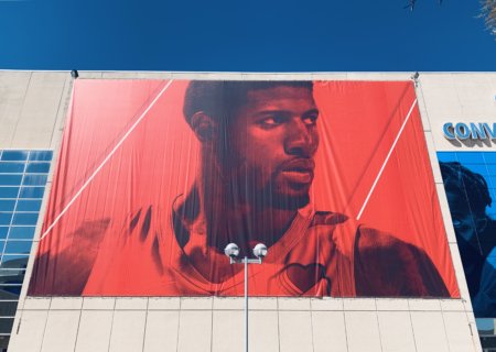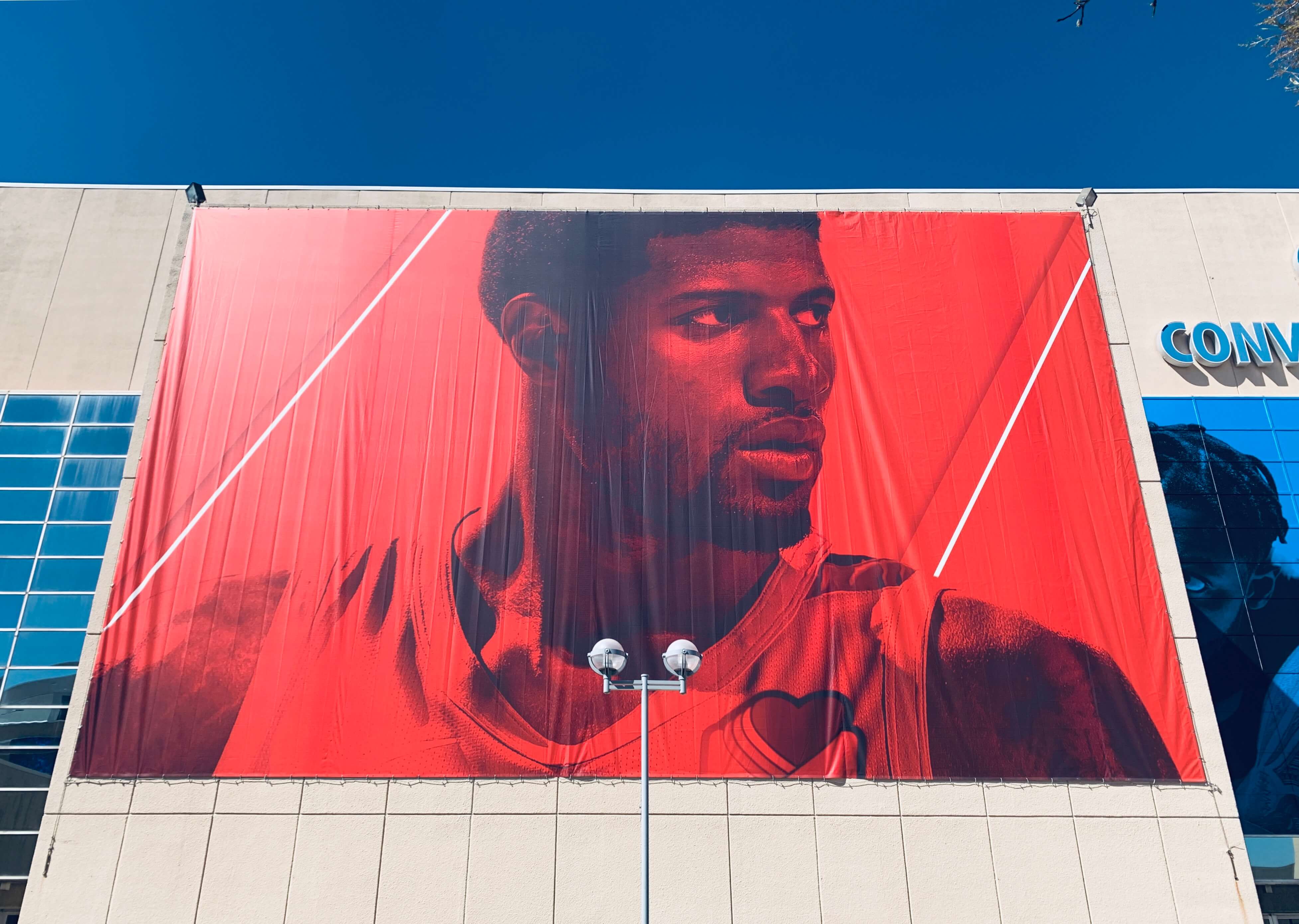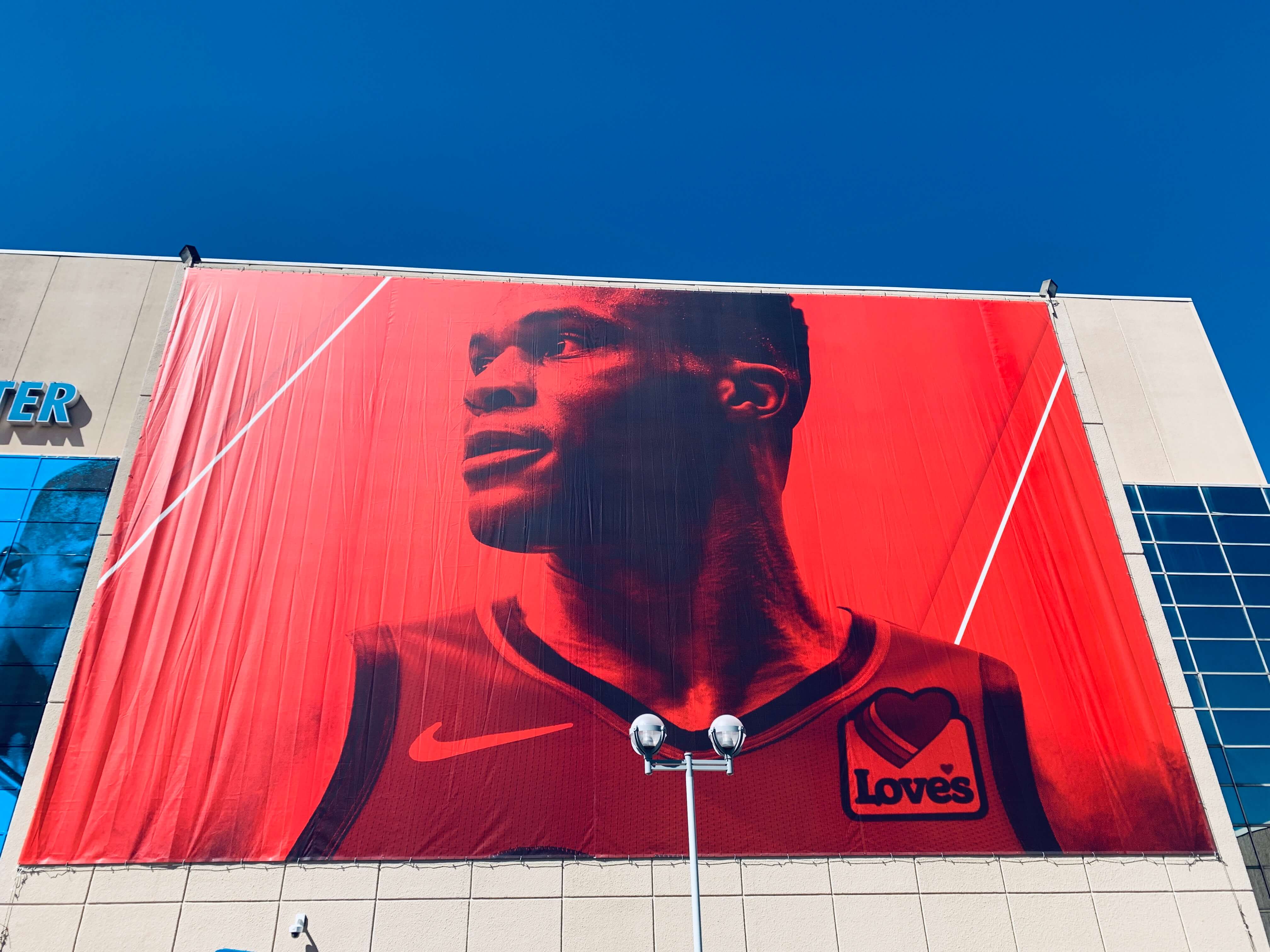 まずは毎年恒例の、チェサピークアリーナの向かいにある、Cox Convention Centerの壁に登場する選手たち。今シーズンは左から、PG、ジェラミ、アダムス、デニス、ラス。