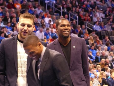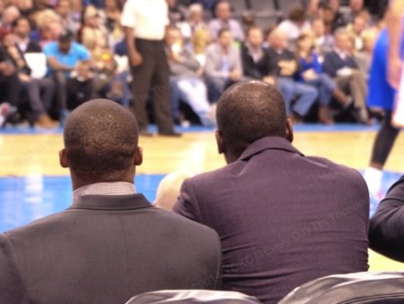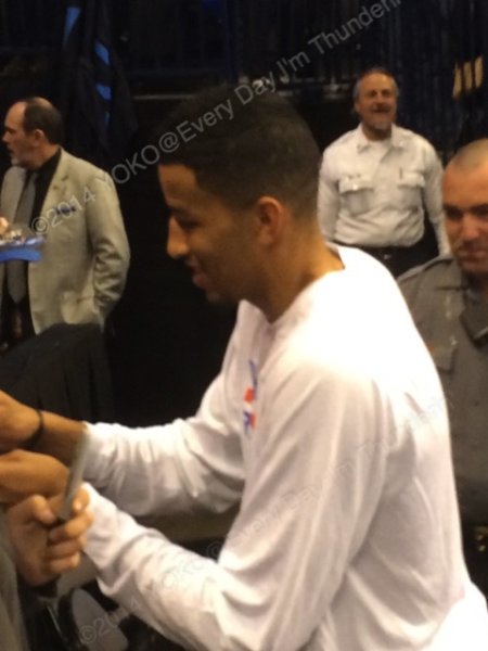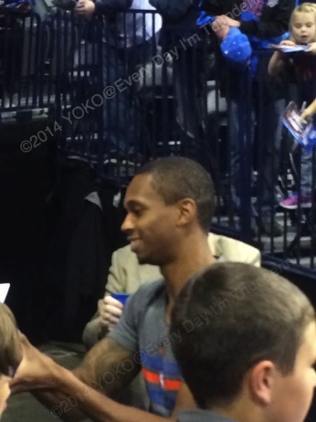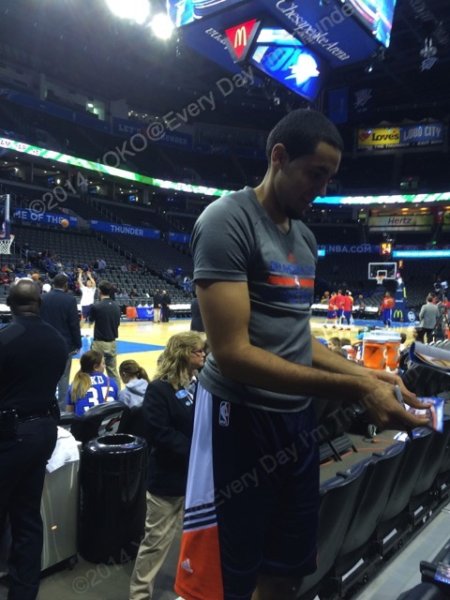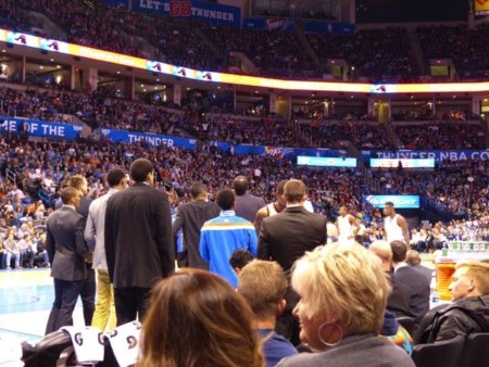 この時はまだ怪我人だらけのサンダー。ベンチにはKD、ラスを含むスーツ姿の選手がたくさん座っていて、皆さんご存知のように、試合が盛り上がり始めるとずーっと立って応援するわけですよ。