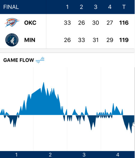 試合開始から9分間、サンダーの得点はわずか9点。12分が経過して両チームのフィールドゴールは、3ポイントショット22本中4本成功を含む、47本中13本の成功に終わった。両チームのターンオーバーは9回あったが、誰もミスから簡単に得点につなげることができなかったので、どちらのチームにとっても痛手にはならなかった。